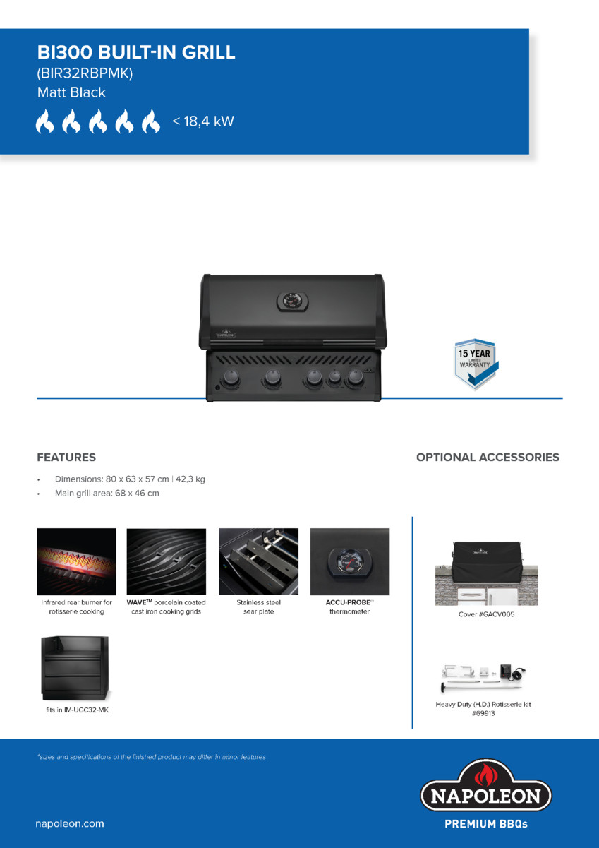 Vestavný plynový gril BIR 32 Phantom vás na první pohled přesvědčí, že právě ten potřebujete mít na zahradě. Má čtyři hlavní nerezové hořáky a jeden zadní pro rotisserii. Díky tomu se může pyšnit výkonem 17,3 kW. K tomu je vybaven ergonomickými ovladacími knoflíky, teploměrem nebo porcelánem smaltovaným litinovým roštem WAVE™ ve tvaru klasických vlnek.