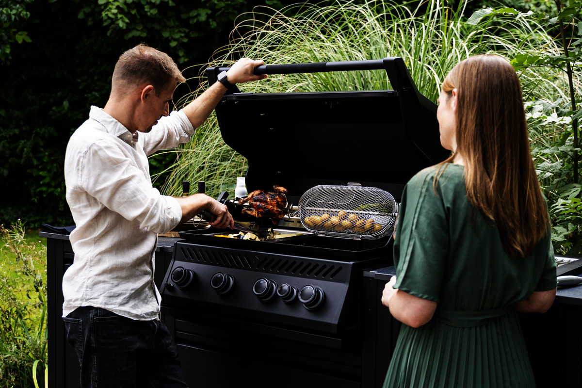 Stačí nasadit rožeň a můžete pomalu a rovnoměrně grilovat kuře, ale díky vysokému víku klidně i celou kýtu nebo malé sele.
