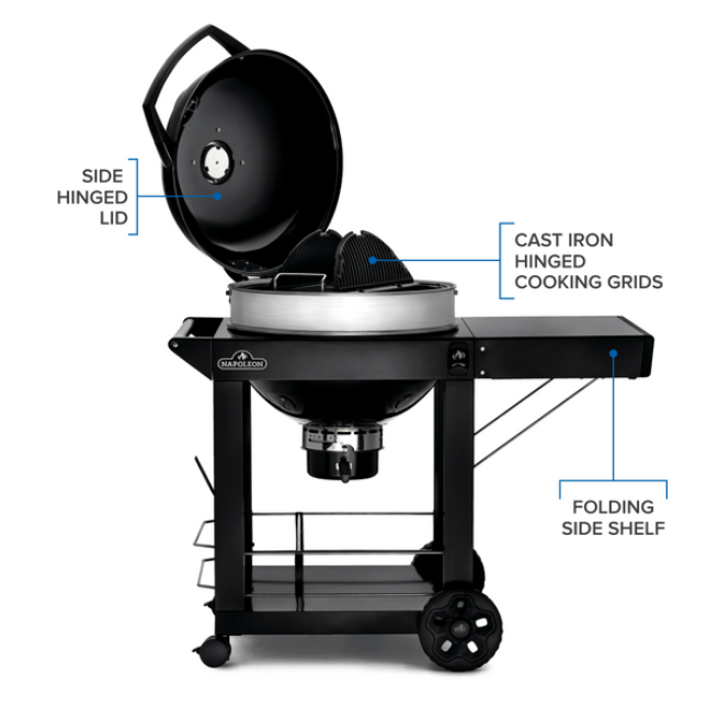 A BBQ rajongók abszolút kedvence a grillkocsival kiegészített PRO22K gömbgrill. Rozsdamentes acélból készült lehajtható oldalsó polccal, továbbá a könnyed mozgatás érdekében négy kerékkel rendelkezik. A grillkocsin további tároló helyeket találunk. A sütő WAVE™ porcelán bevonattal ellátott öntöttvas grillráccsal rendelkezik, mely három különböző magasságban állítható, oldalai felnyithatók, így könnyedén dolgozhat az izzó faszénnel, illetve pótolhatja azt anélkül, hogy az egész grillrácsot ki kellene emelnie. A hamugyűjtő könnyedén eltávolítható és könnyen tisztítható.