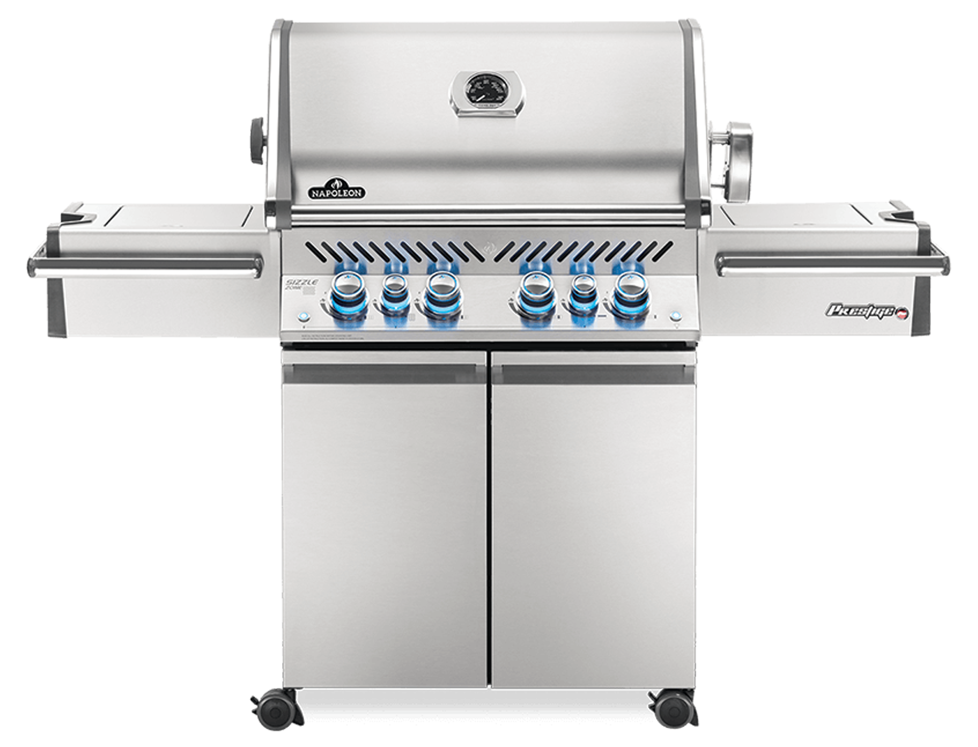 A gázgrillek között a PRESTIGE PRO 500 igazi csúcs kategória. A grillsütő 4+2 égővel rendelkezik. Négy klasszikus rozsdamentes alap égő, egy hátsó égősor a nyárshon sütéshez és egy oldalsó infravörös Sizzle Zone égő, melyek akár 800 °C-os hőmérsékletet is képesek előállítani. Az égők összteljesítménye 25,7 kW. A grillezés szerelmesei minden bizonnyal értékelni fogják a tágas tároló helyeket, a jégkocka tárolót, az integrált vágódeszkát, a többszínű háttér világítású vezérlőgombokat, az integrált hőmérőt, belső halogén világítást és a megerősített rozsdamentes acél grillrácsot, a már megszokott WAVE™ hullám formavilágban.