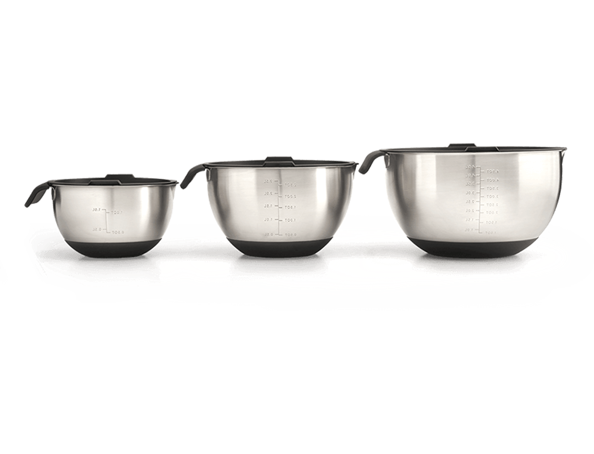 Víceúčelová sada misek ve třech velikostech: 1 l, 2,5 l a 4,5 l. Každá miska má silikonové ucho, žlábek pro snadné vylévání a silikonový spodek, takže ani při intenzivním míchání nekloužou po povrchu. Praktická vzduchotěsná víka udrží potraviny dlouho čerstvé.