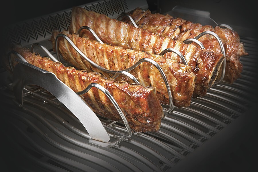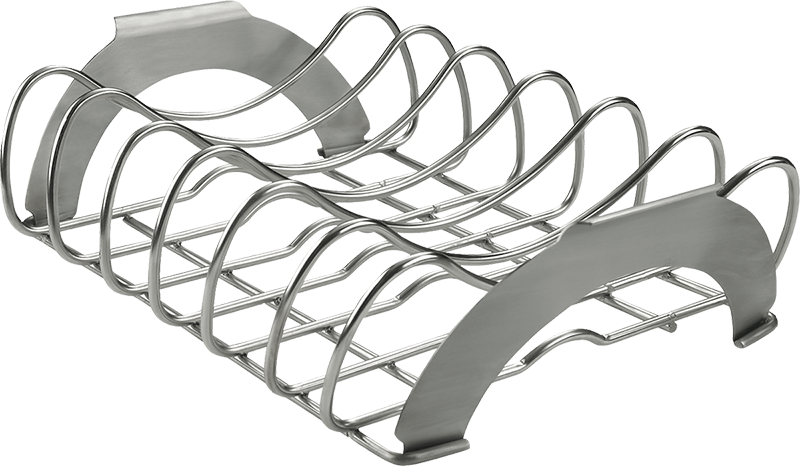 Nerezový stojan určený na grilování žebírek nebo zeleniny. Teplo se díky rozložení surovin dostane všude stejně, a tak se dočkáte perfektně upečeného masa ze všech stran. Určen je jak pro plynové, tak pro grily na dřevěné uhlí.